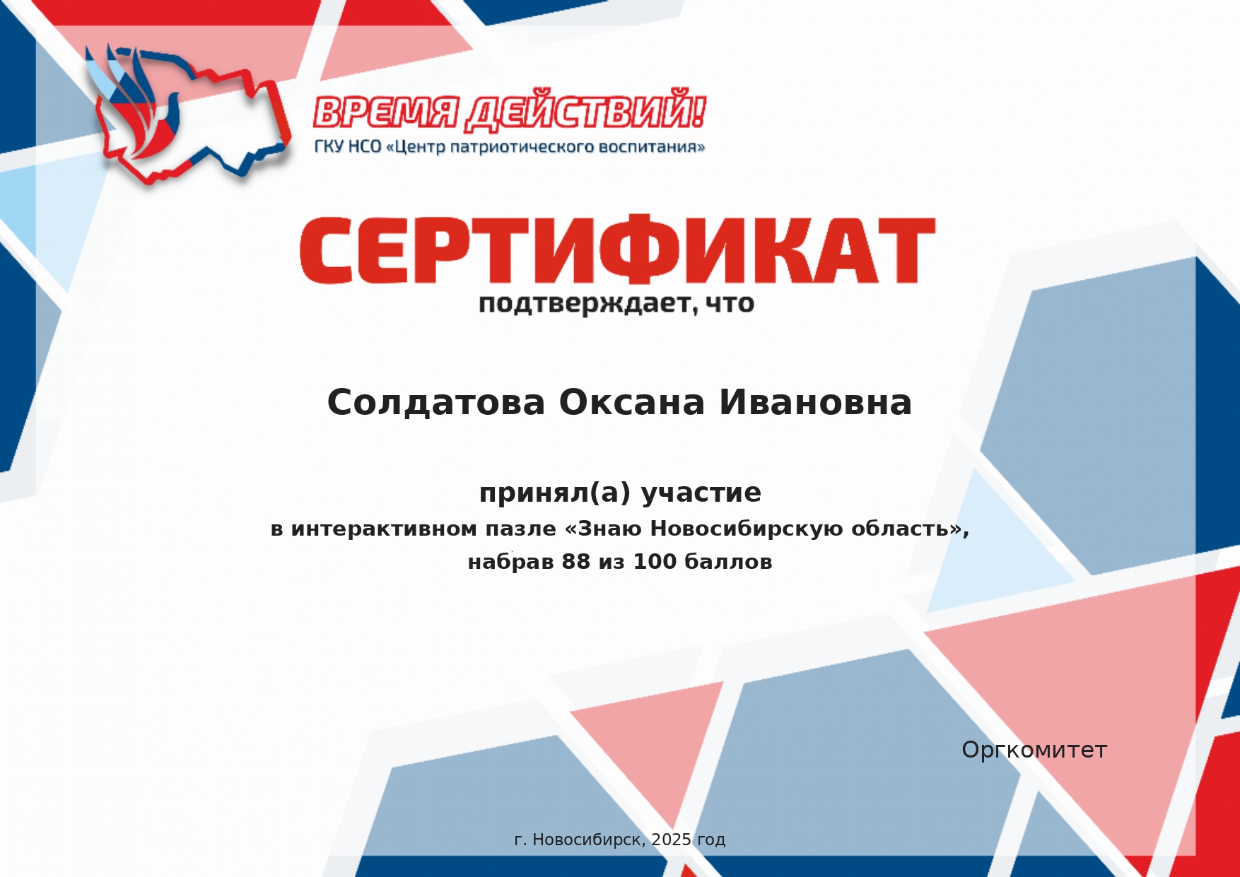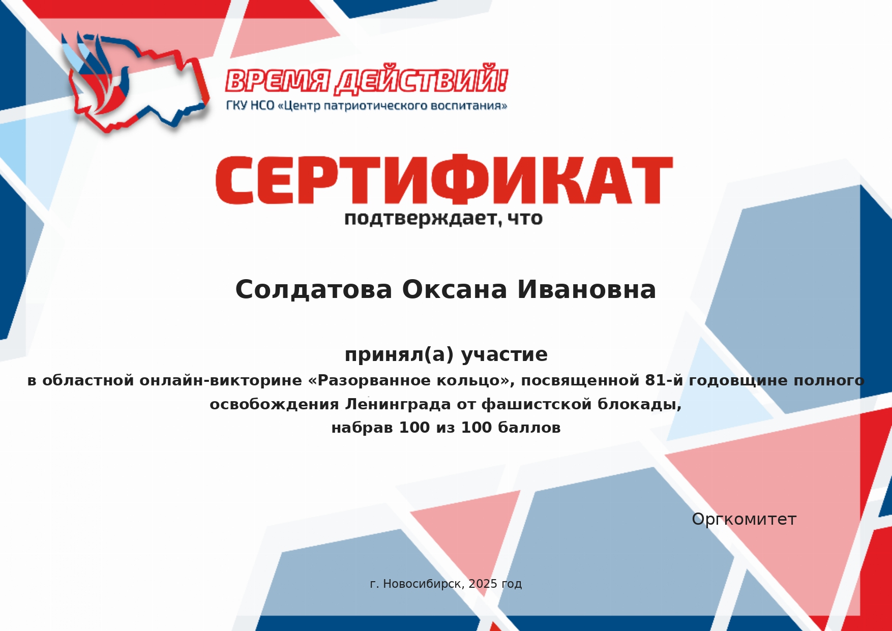 Сертификат областная онлайн - викторина "День народного единства"