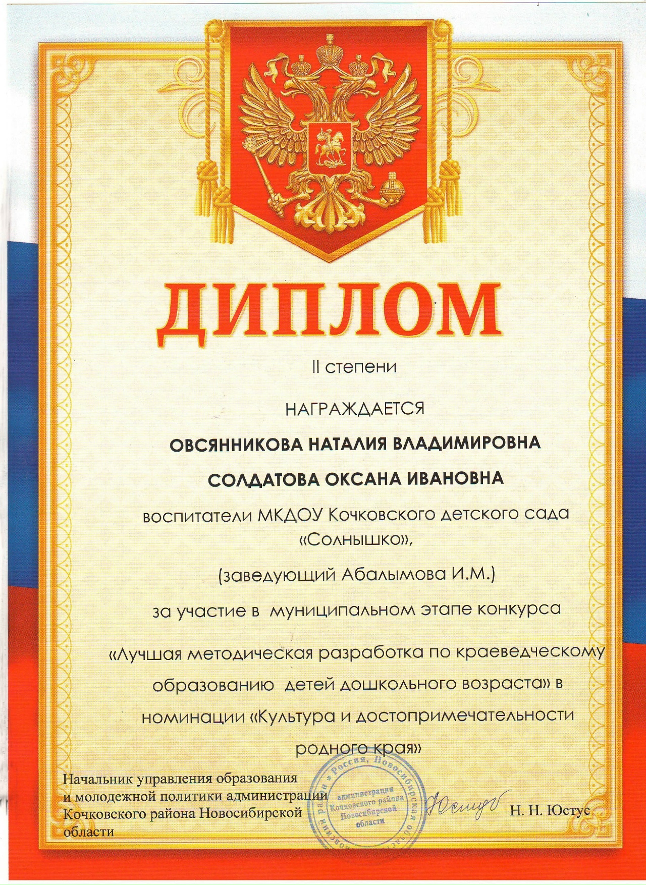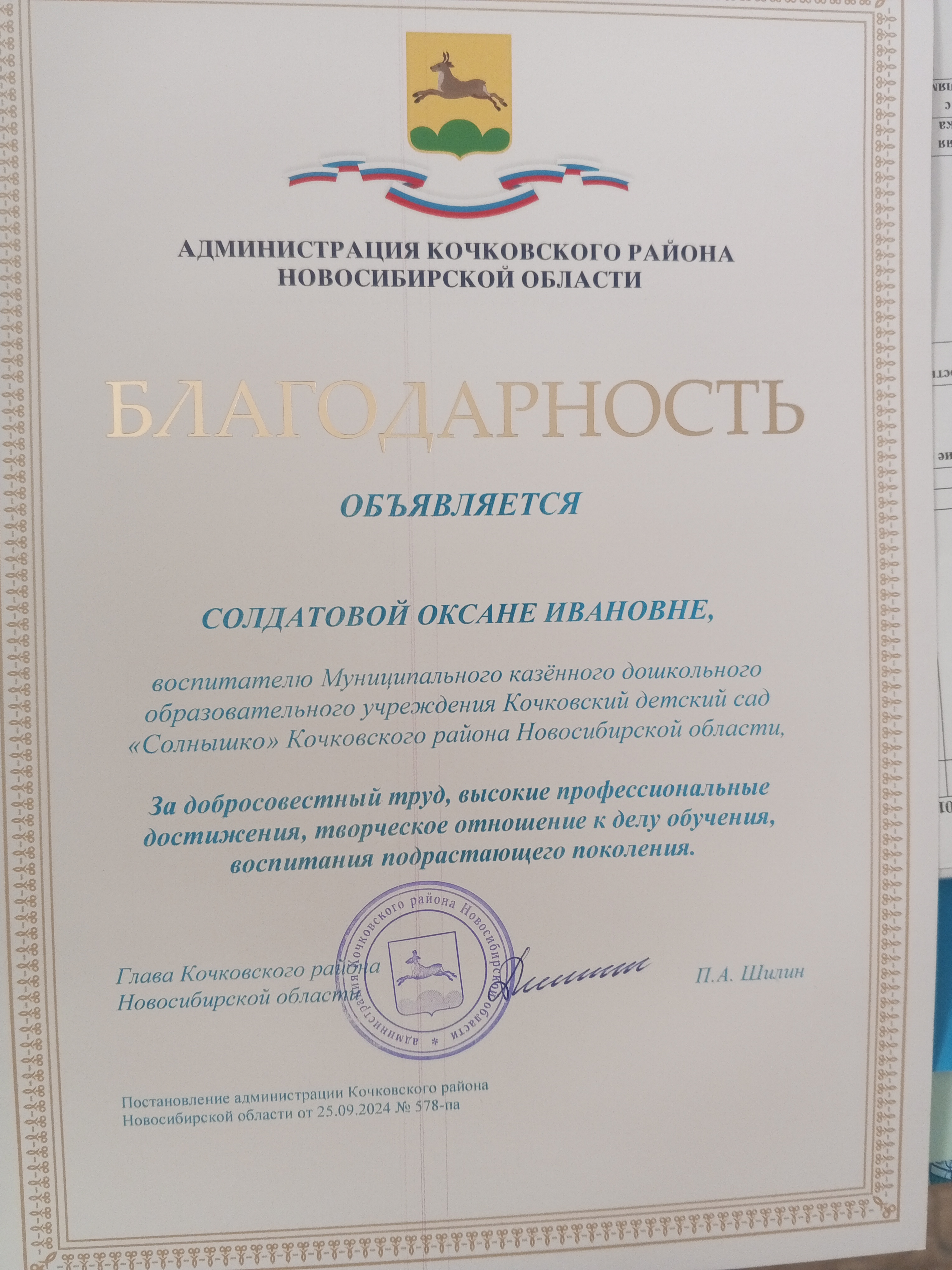благодарность Администрации Кочковского района Новосибирской области