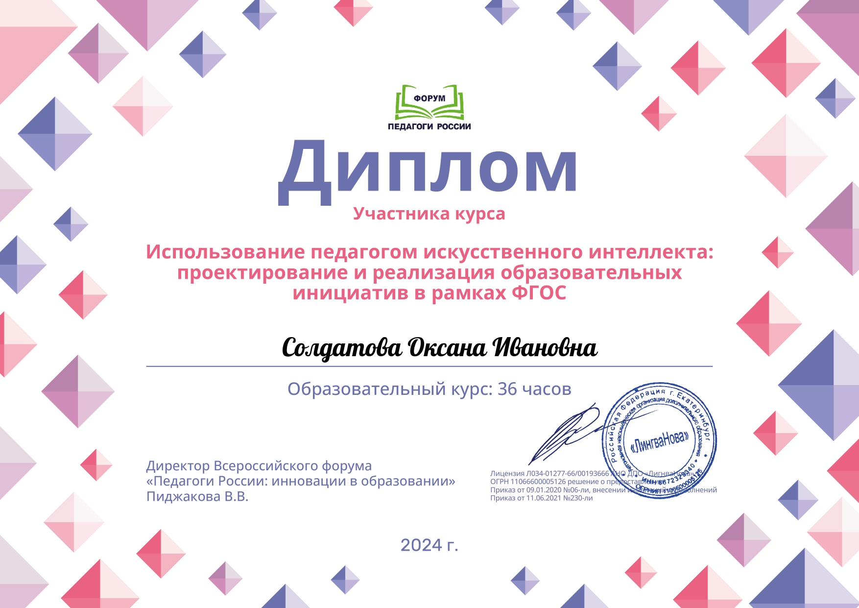 Диплом участника курса "Использование педагогом искуственного интеллекта: проектирование и реализация образовательных инициатив в рамках ФГОС"