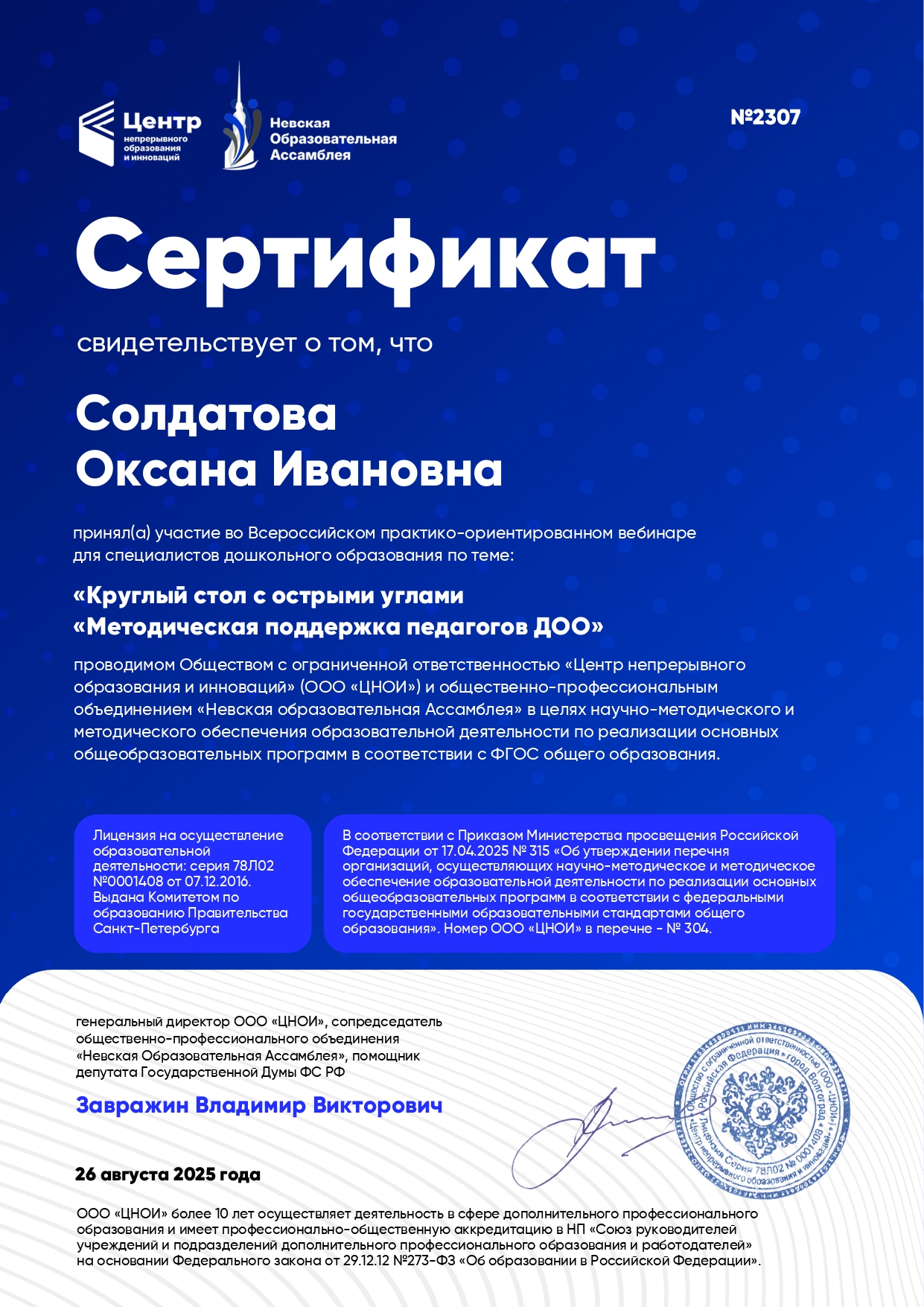 Сертификат МПАДО об участии в вебинаре
